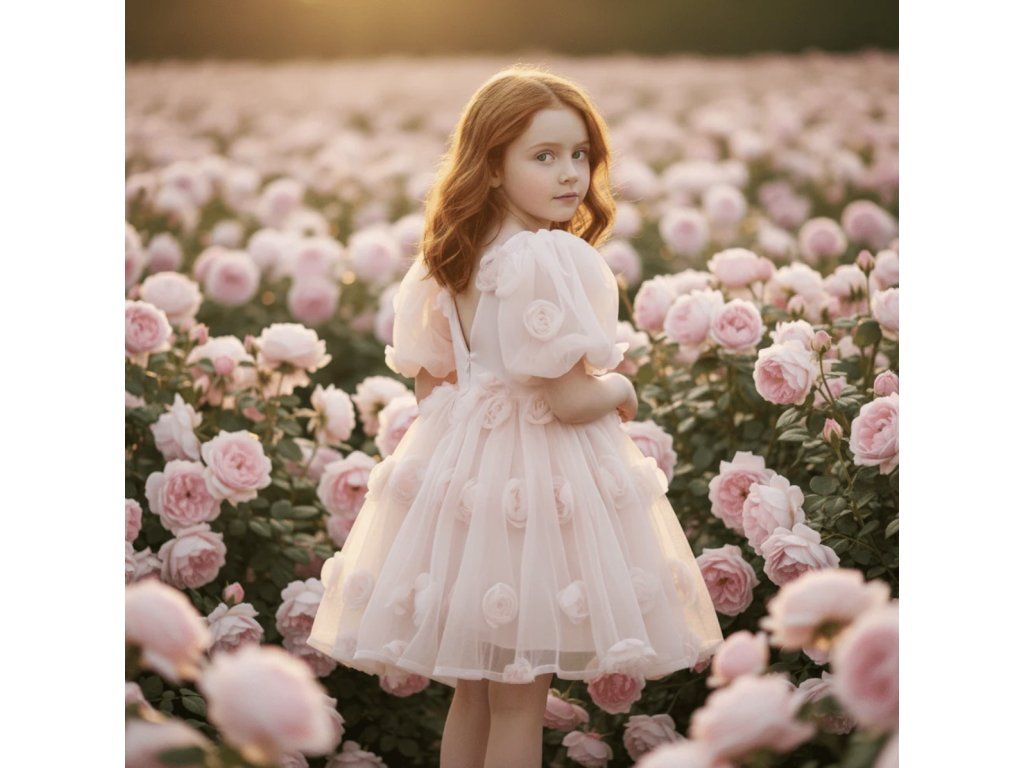 DOLLYne charakteristické šaty s výstrihom do V sú čerstvo nazbierané v ružovej záhrade za hradom... Sú vyrobené z tylu zdobeného krásnymi 3D ružovými kvetmi a majú objemné nafúknuté rukávy. Výstrih do V na chrbte im dodáva elegantný šarm.
