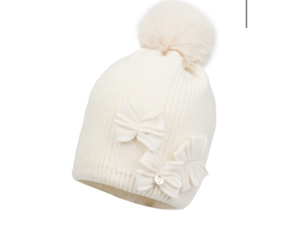 Čiapka zdobená brmbolcom z umelej kožušiny, vyzerá obzvlášť očarujúco. Tri ozdobné mašle navyše dodávajú eleganciu a dievčenský šarm, vďaka čomu je ideálnou voľbou na zimné prechádzky alebo špeciálne príležitosti.