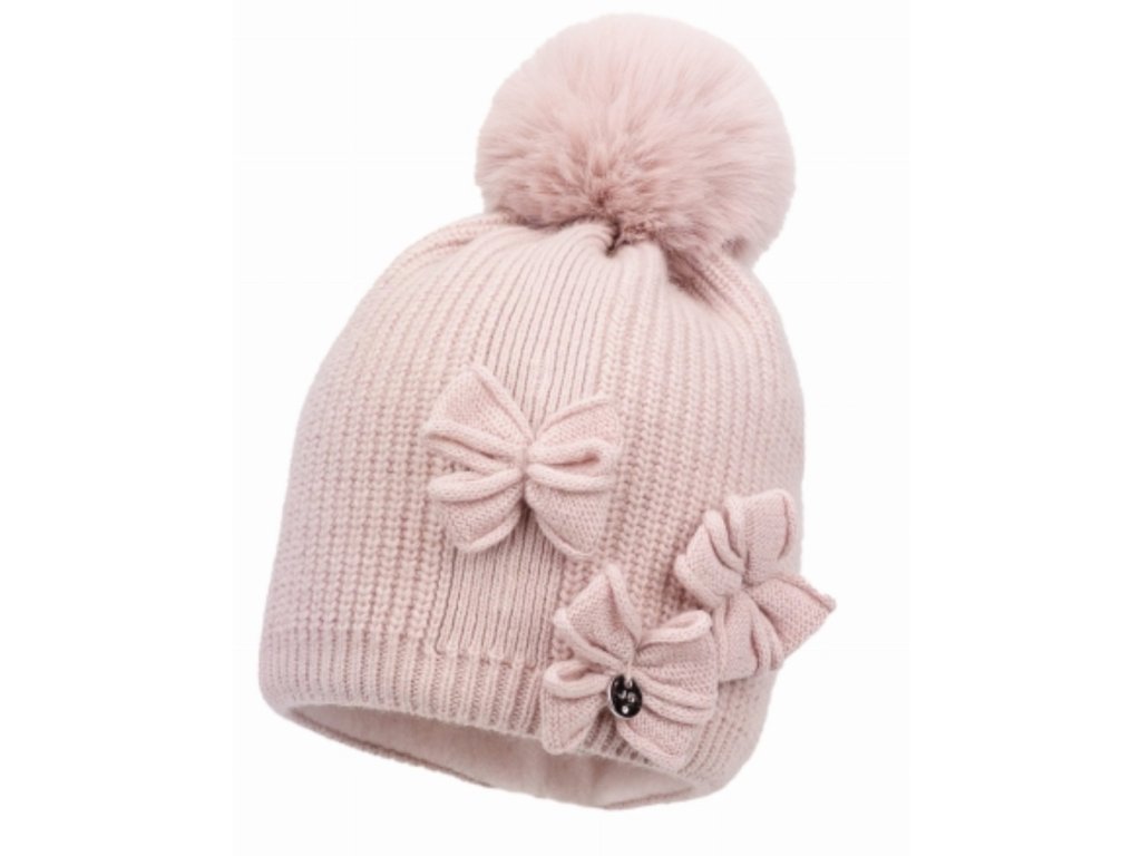 Čiapka zdobená brmbolcom z umelej kožušiny, vyzerá obzvlášť očarujúco. Tri ozdobné mašle navyše dodávajú eleganciu a dievčenský šarm, vďaka čomu je ideálnou voľbou na zimné prechádzky alebo špeciálne príležitosti.