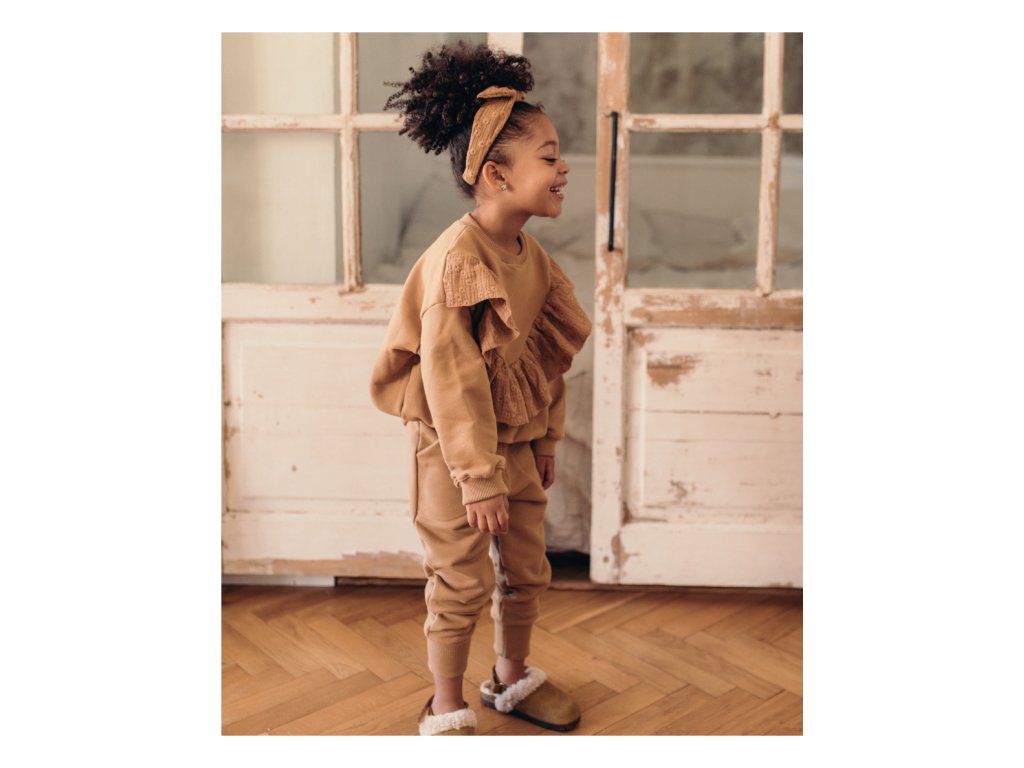 Pohodlná oversize mikina s vyšívaným volánom. Vyrobené z úpletu karamelovej farby.