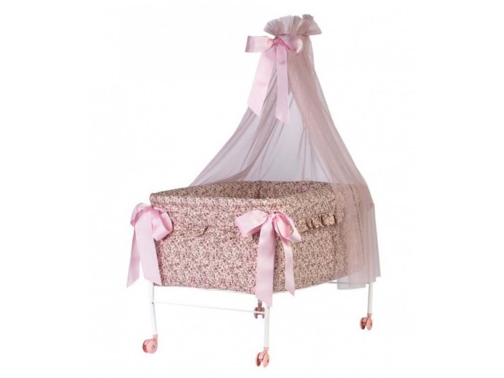 Táto posteľ pre bábiky na ružových kolieskach má skladací, ľahký, bielo lakovaný kovový rám . Kolíska je vyrobená z vysoko kvalitnej béžovej bavlny s malými ružovými kvietkami. Volánkový lem, vzdušný ružový tyl zavesený na úzkom kovovom ráme a trblietavé saténové mašle dodávajú luxusný nádych.