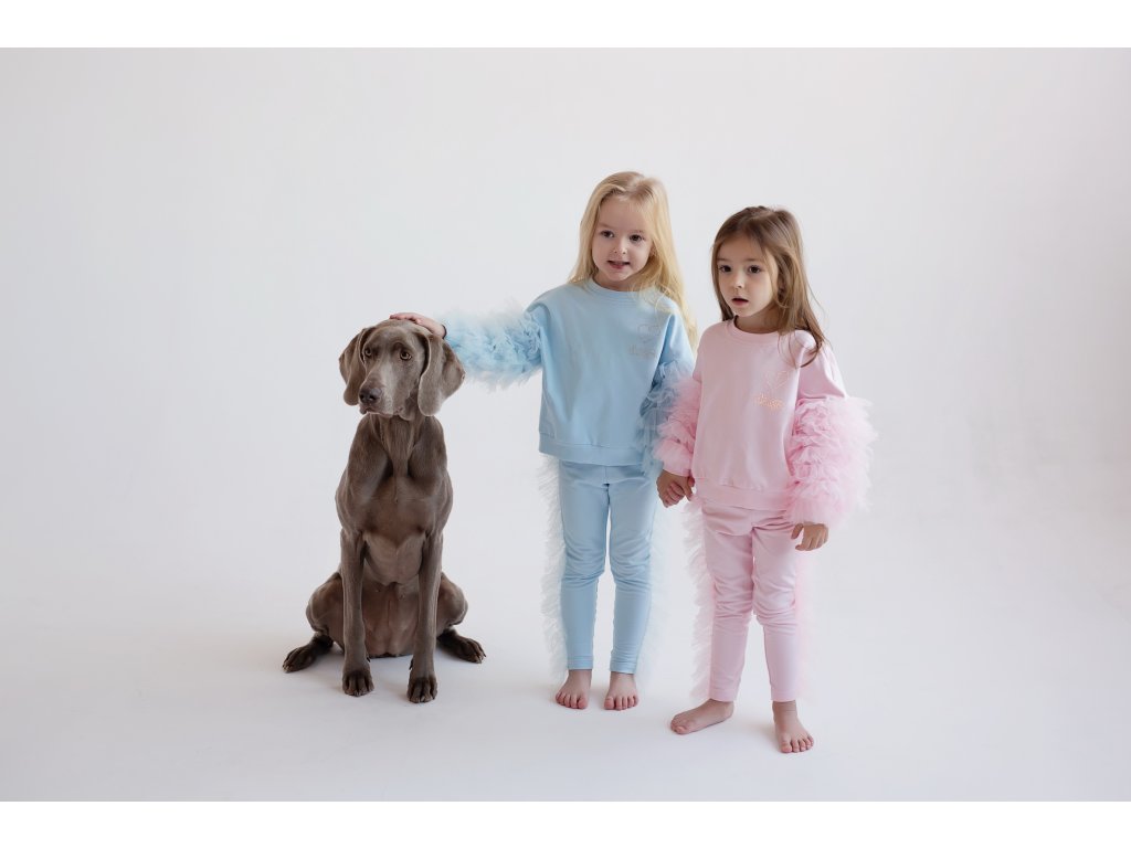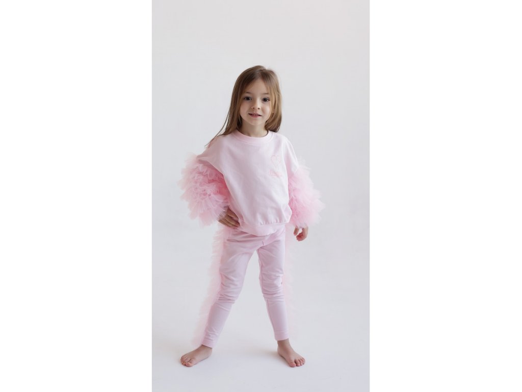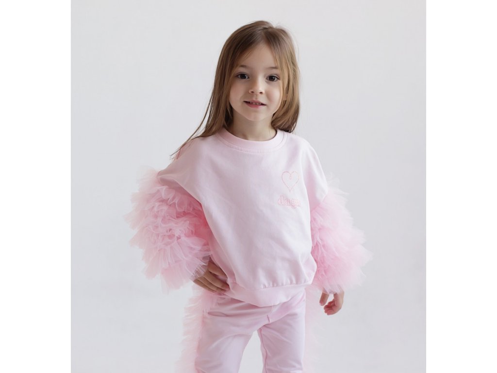 Dievčenská krásna mikina s bohatými tylovými volánikmi na rukávoch.