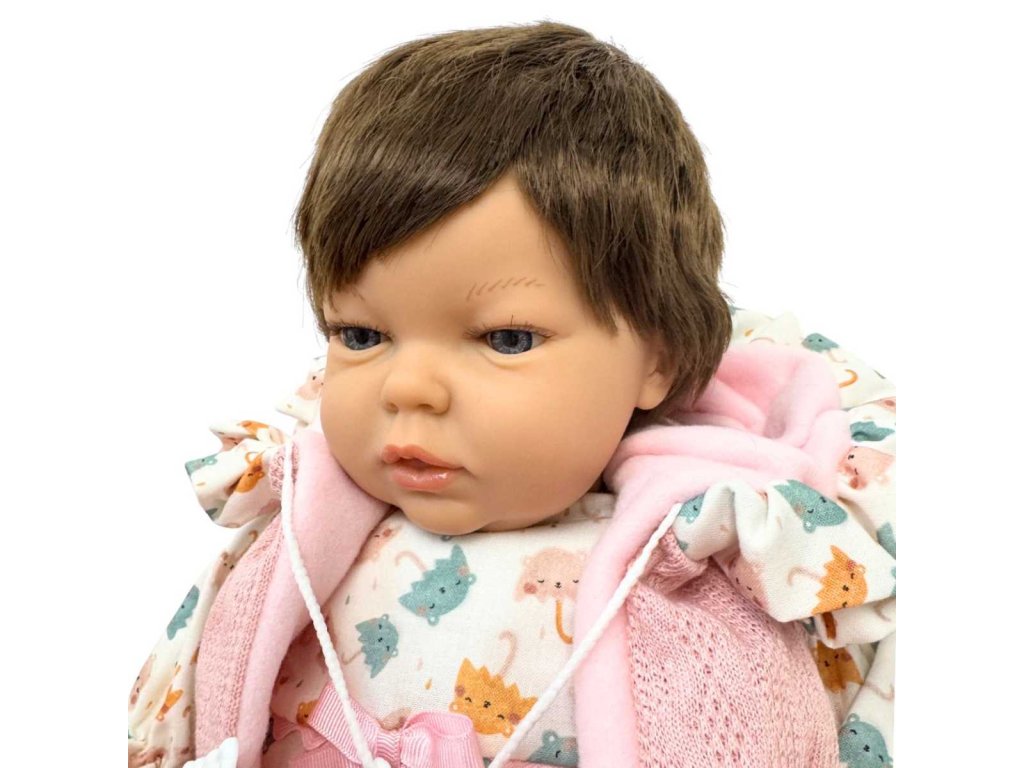 Bábika Laura má veľmi realistický pohľad , v pusinke udrží cumlík a na sebe má krásne oblečenie - vestu so zdobenou kapucňou ladiacou s overalom a capáčikmi. Nesmie chýbať aj hniezdočko na spanie bábätka.