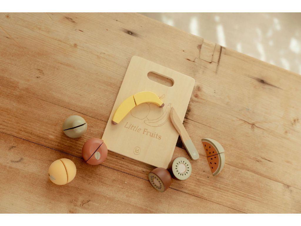 Pripravte ovocnú desiatu s touto veselou sadou dreveného krájacieho ovocia! V sade nájdete šesť druhov ovocia: jablko, hrušku, banán, kivi, pomaranč a kúsok melónu – každý z nich je možné rozkrojiť dreveným nožíkom na dve polovice a vďaka suchému zipsu ich opäť ľahko spojíte späť.