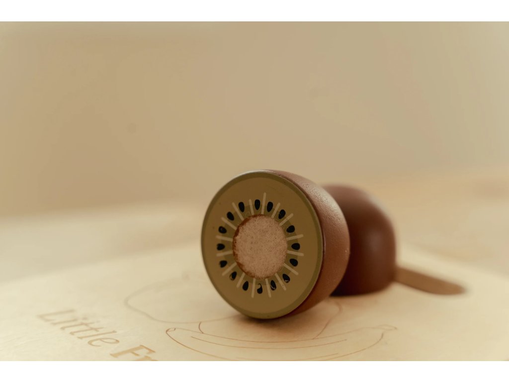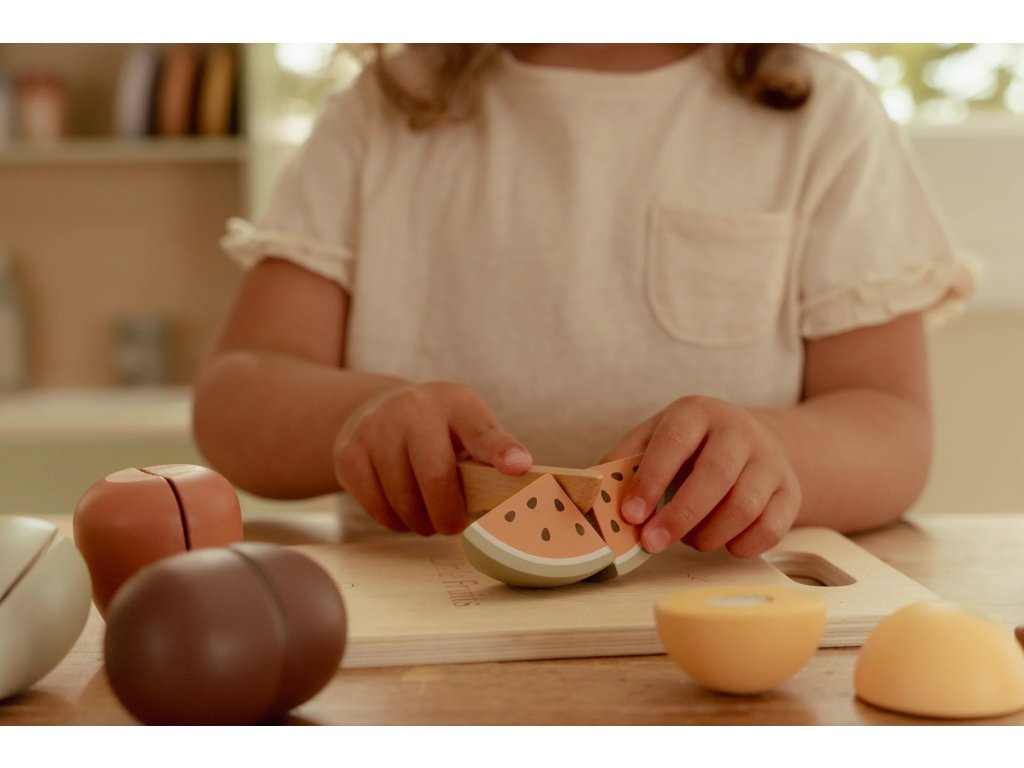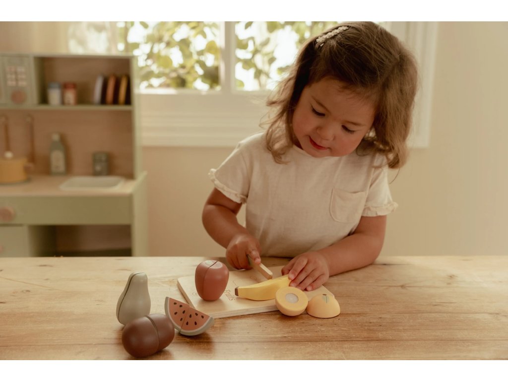Súčasťou sady je aj doska na krájanie a drevený nôž, takže si malí kuchári môžu vyskúšať prípravu zdravej desiaty presne ako dospelí. Skvelý spôsob, ako rozvíjať jemnú motoriku, koordináciu ruky a oka aj hru na role.
