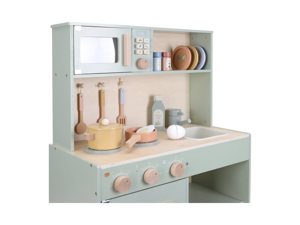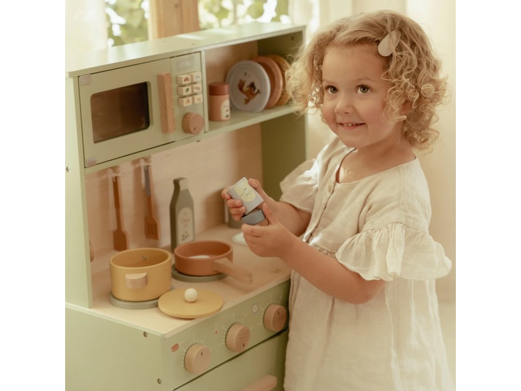 Krásna drevená kuchynka Little Dutch ponúka všetko, o čom malý kuchár či kuchárka sníva, keď vymýšľa nové recepty pre rodinu či svoje bábiky a obľúbené plyšáky. S panvicou, hrncom, tromi tanierikmi a sadou kuchynského náčinia nie je problém pripraviť niekoľko chodov naraz. Rúra upečie koláč, na sporáku sa uvarí zelenina, mikrovlnka rýchlo ohreje, čo je potrebné. K dispozícii je aj olivový olej, vajíčko, soľ a korenie na dochutenie. Po práci si kuchár umyje ruky v dreze. Skrinka ponúka priestor na uloženie potravín.