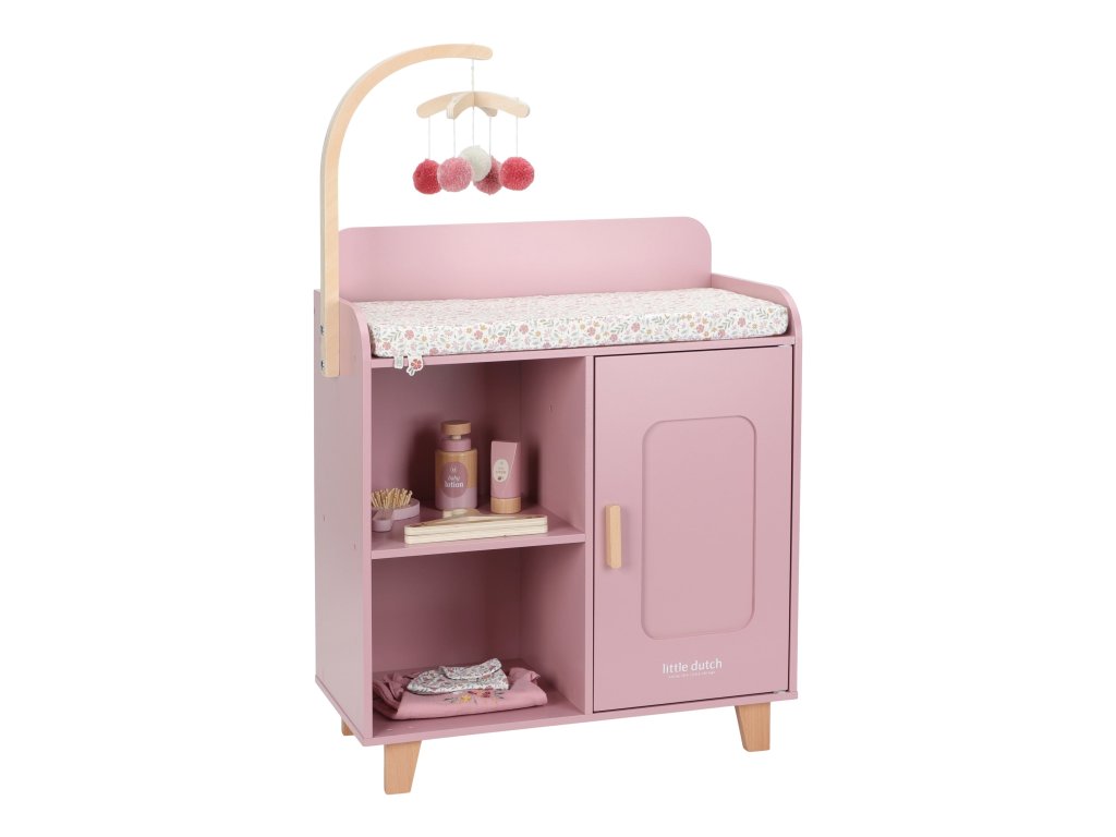 Elegantný prebaľovací pult Little Dutch umožňuje deťom napodobňovať každodennú starostlivosť o bábätko a starať sa o bábiky rovnako, ako sa mamička či otec starajú o svoje bábätko. Súčasťou balenia je mäkká prebaľovacia podložka s romantickou kvetinovou potlačou, závesný kolotoč, spací vak, textilná plienka, dve ramienka a drevené doplnky pre starostlivosť o bábiku. Praktická skrinka a poličky v spodnej časti prebaľovacieho pultu umožňujú mať všetko potrebné pre starostlivosť o bábiku vždy po ruke a upratané.