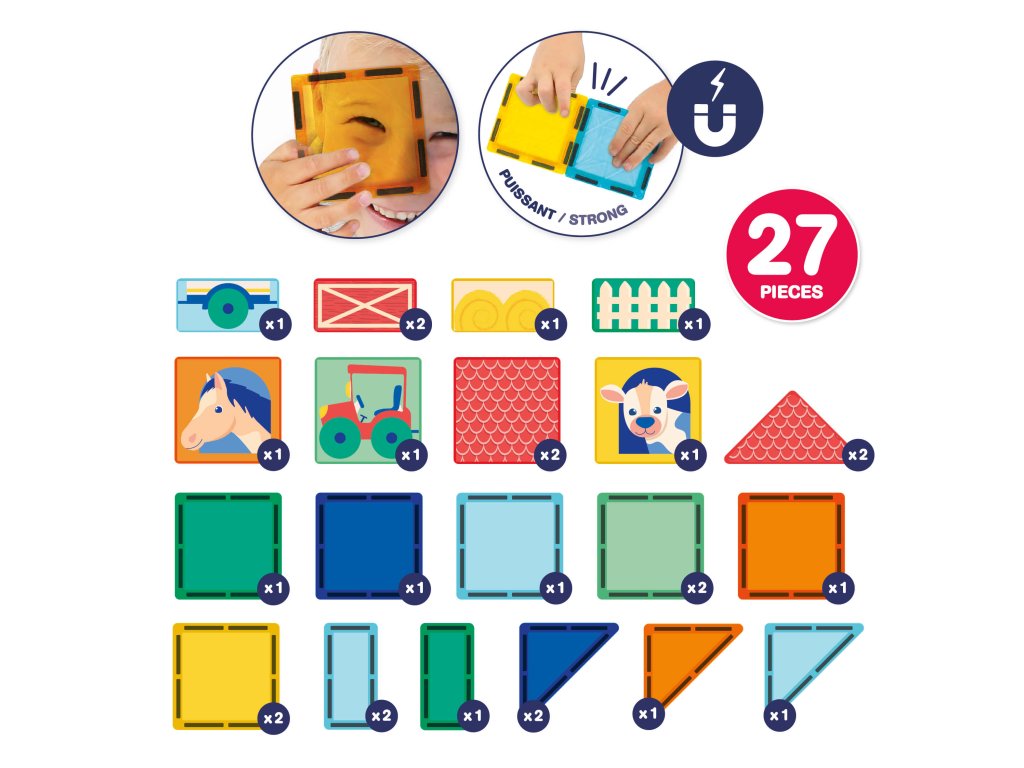 Rozviňte detskú kreativitu, predstavivosť a logické myslenie s touto originálnou magnetickou stavebnicou Ludi s tabuľou a motívmi zo života na farme. Farebná sada s 27 priehľadnými aj ilustrovanými dielikmi ponúka zábavné stavanie v 2D aj 3D. Deti môžu vytvárať scény zo života na farme – postaviť si stajne, polia, výbehy pre zvieratká alebo sa hrať s traktorom a domácimi zvieratami. Priehľadné farebné dieliky vytvárajú pri dopade svetla nádherné tiene a svetelné efekty – ako v kaleidoskope. Nechýbajú ani ilustrované dieliky s motívmi koníka, kravy, ohrady alebo traktora.