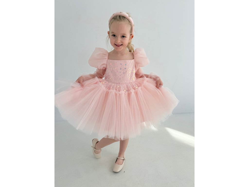 Šaty z mäkkého talianskeho tylu (100 % polyester), látky Marchiano (zloženie: 95 % polyester, 5 % elastan) a ozdobných flitrov.