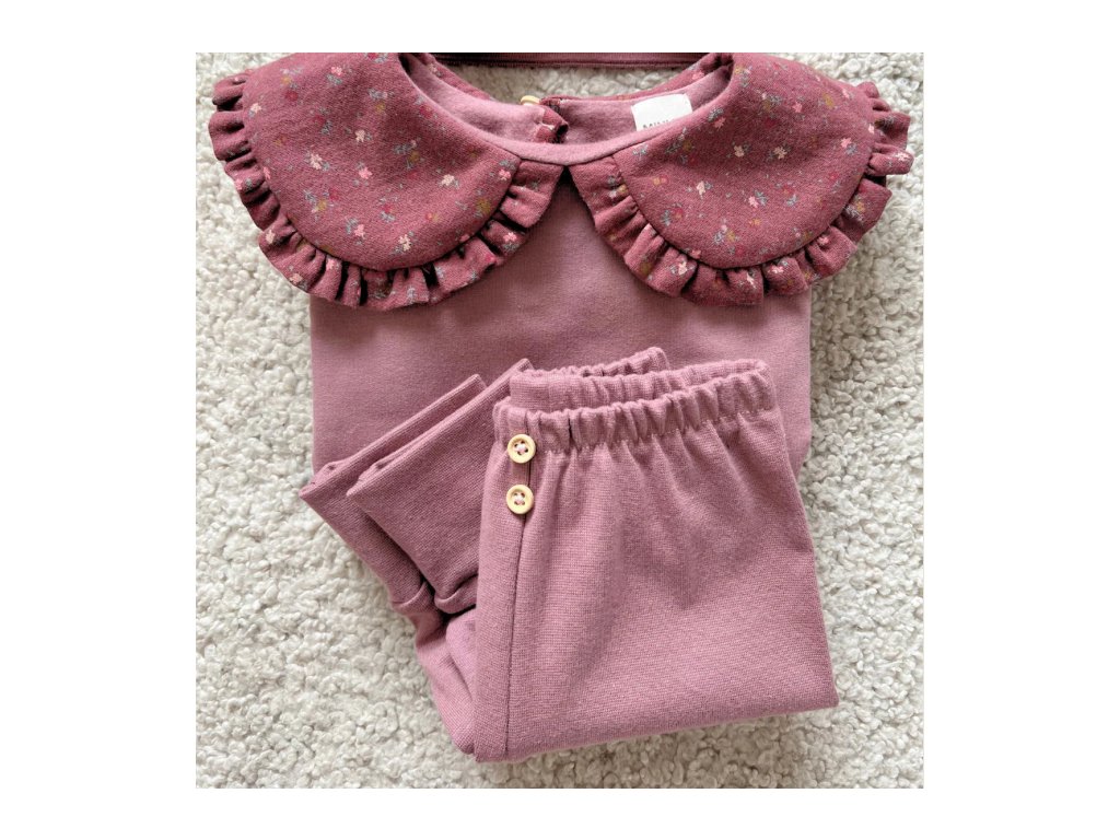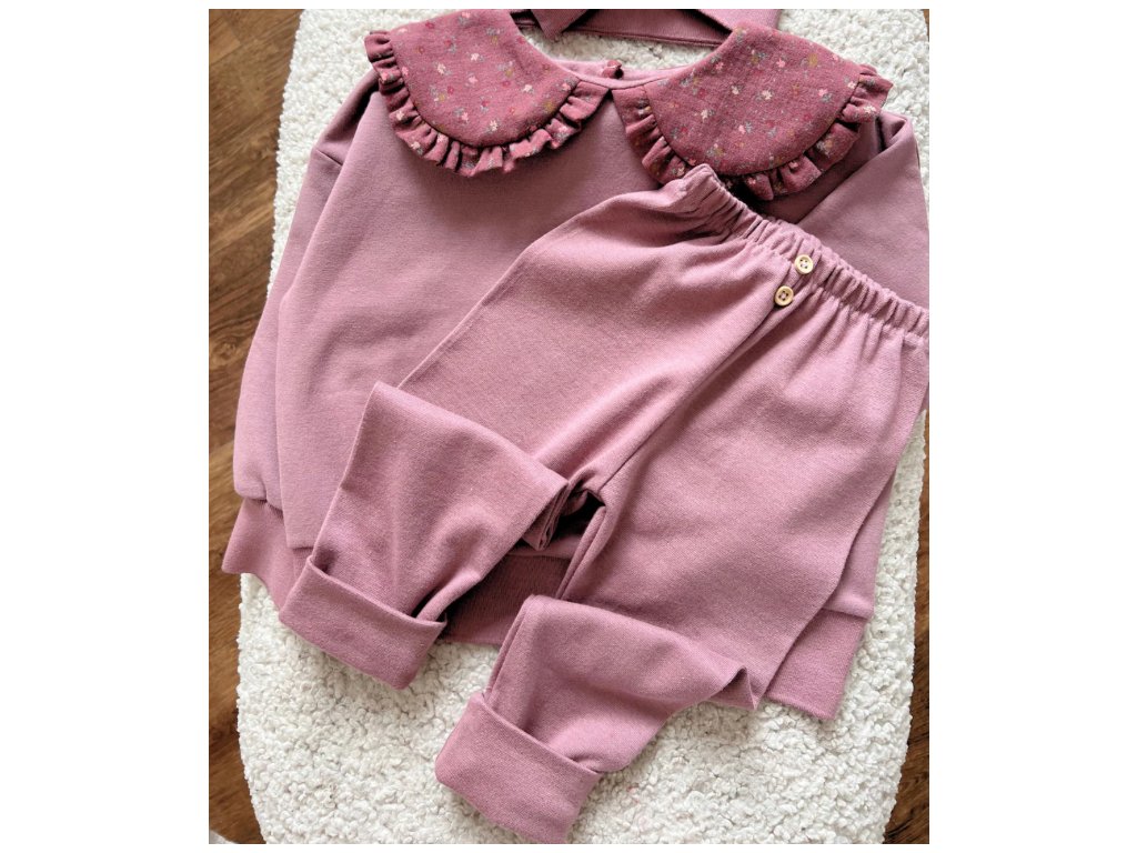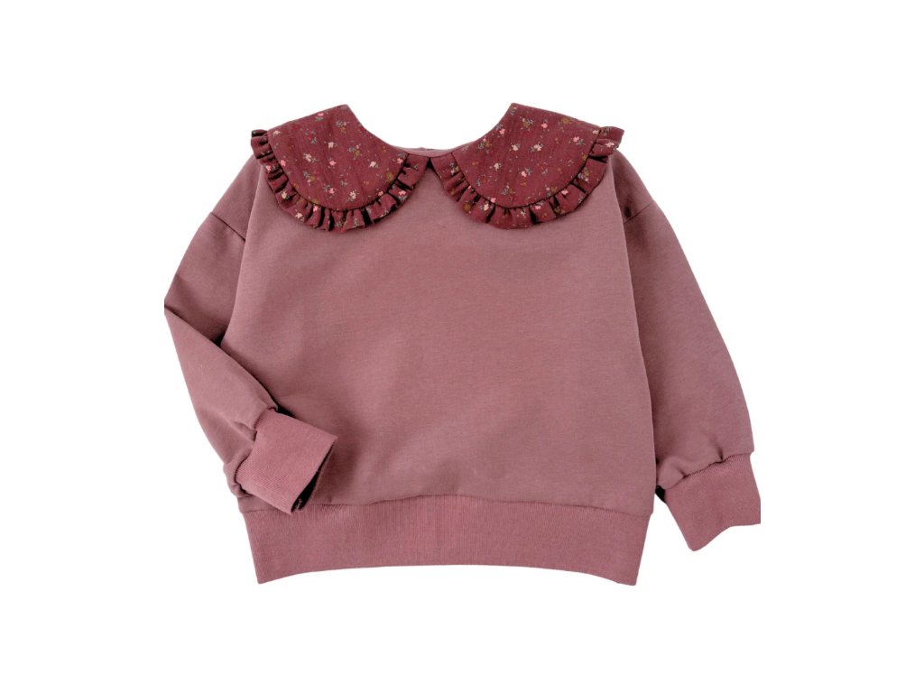 Mikina z kolekcie Basic z elastického materiálu, širšieho strihu a ozdobného goliera z kontrastnej látky. Zapínanie vzadu na drevený gombík.