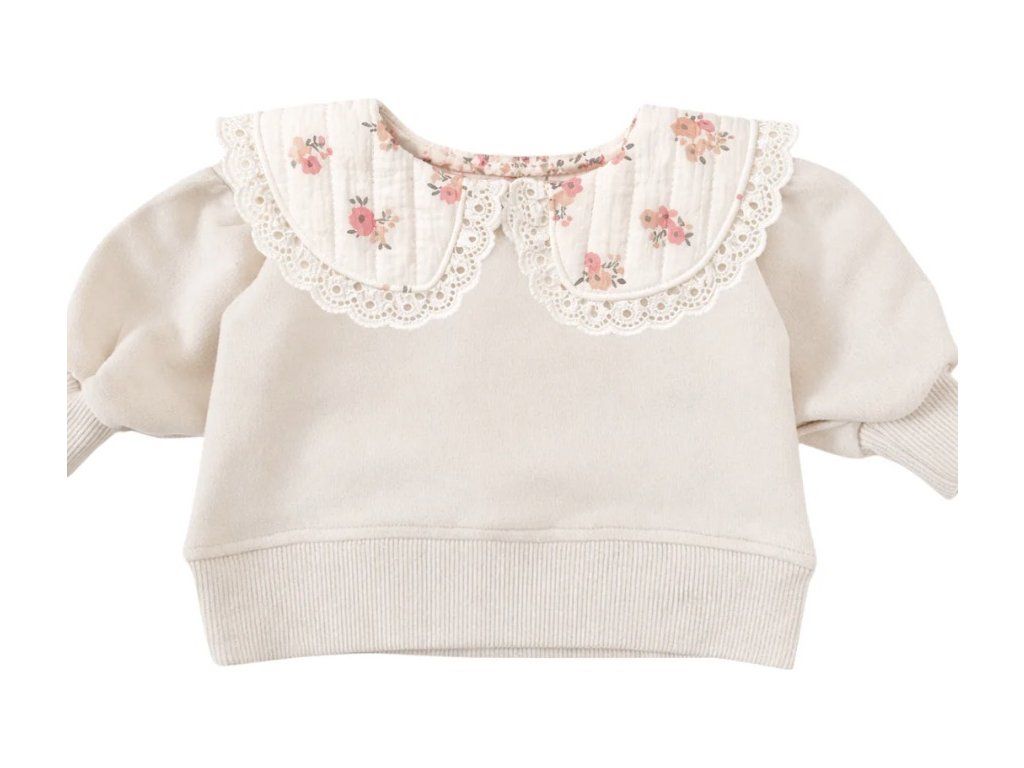 Mikina z kolekcie Basic z elastického materiálu, širšieho strihu a ozdobného goliera z kontrastnej látky. Zapínanie vzadu na drevený gombík.