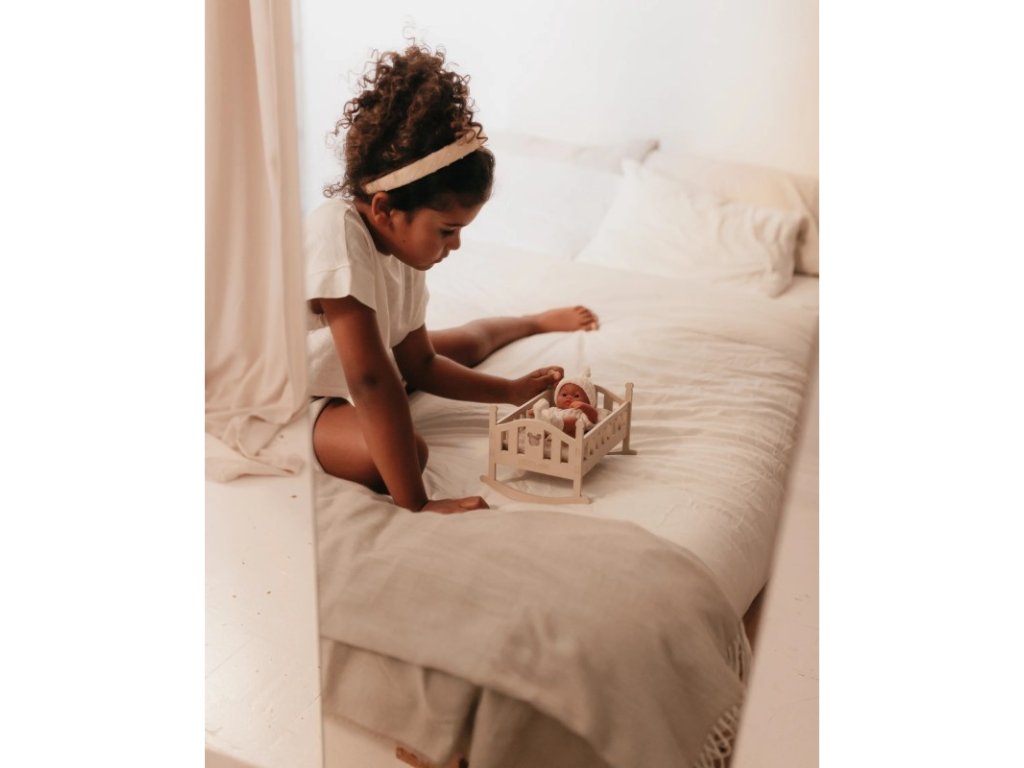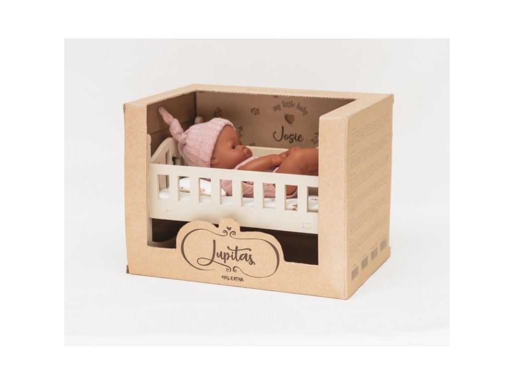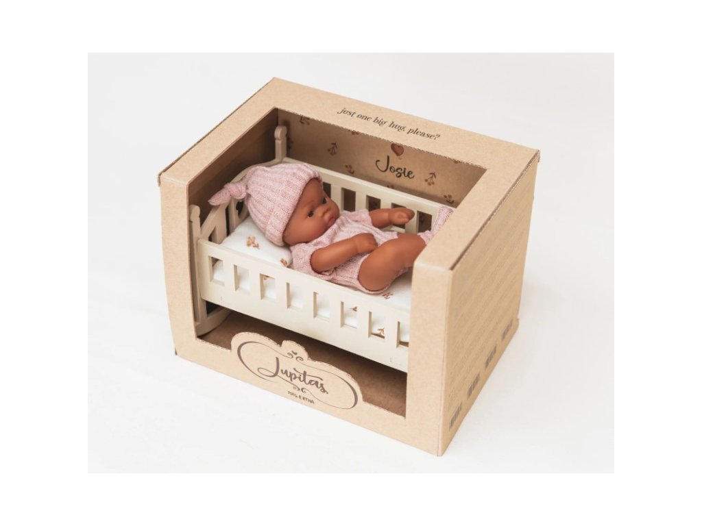 Táto malá bábika Jossie s výškou 20 cm, je zabalená v nádhernej darčekovej sade spolu s ručne vyrobenou hojdacou kolískou z kvalitného dreva. Súčasťou balenia je aj mäkučká posteľná bielizeň – prikrývka, vankúšik a plachta s jemným motívom a jedinečným dizajnom.