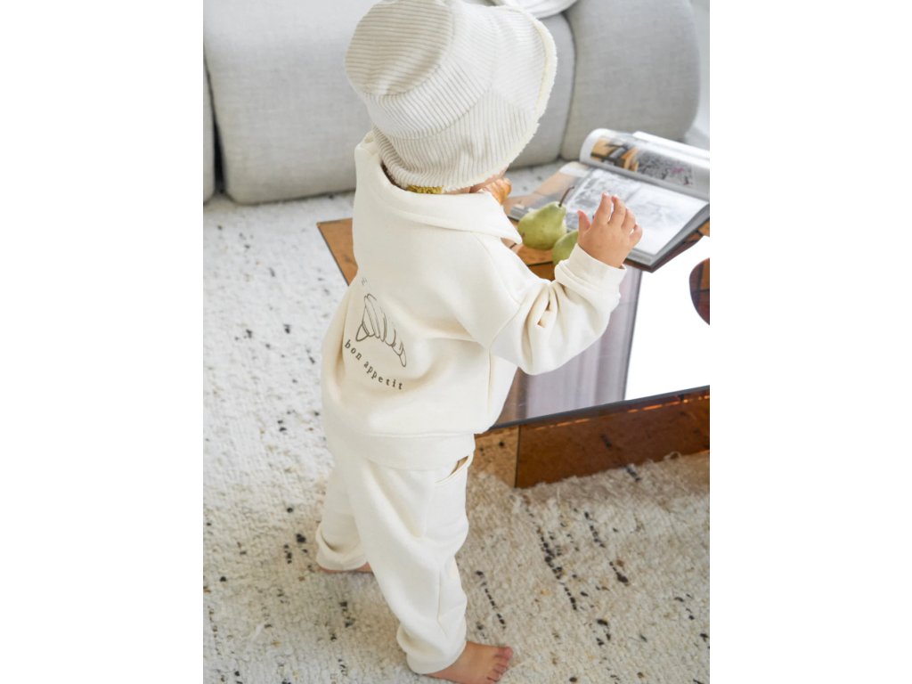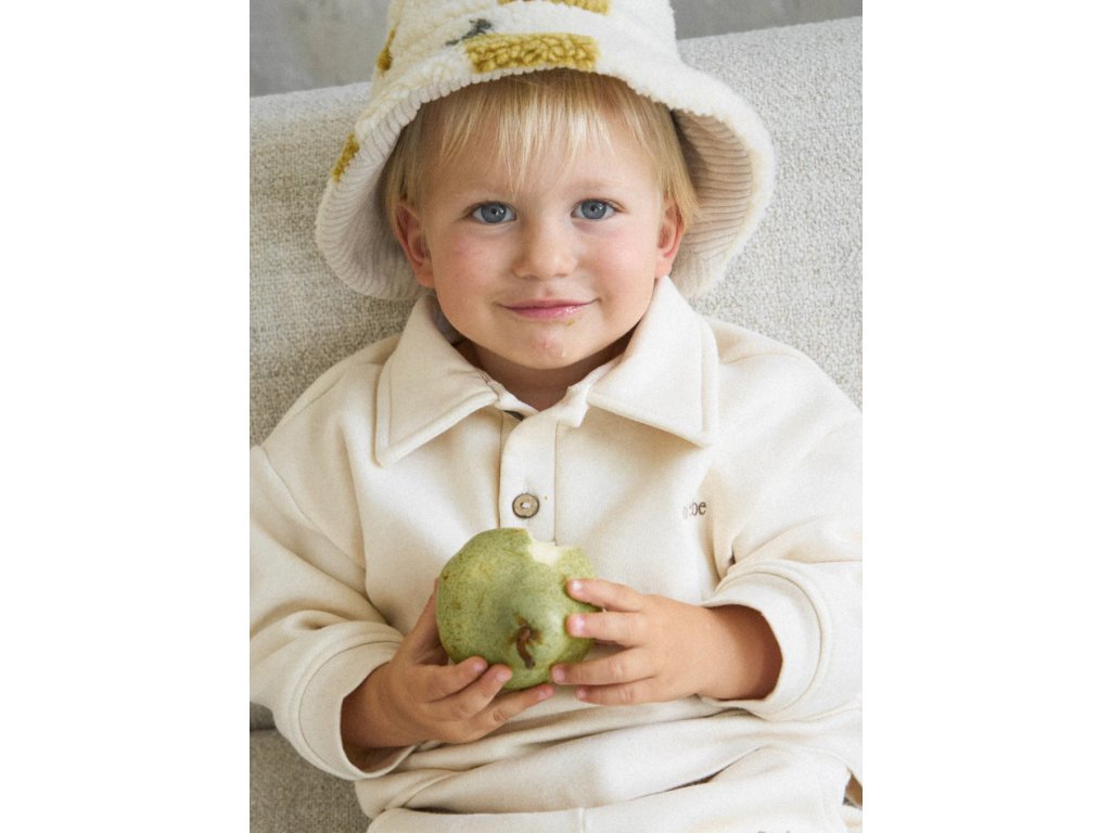 Obojstranný klobúk vyrobený z béžového manšestru a úpletu z jahňacej kože s hruškovitým vzorom.