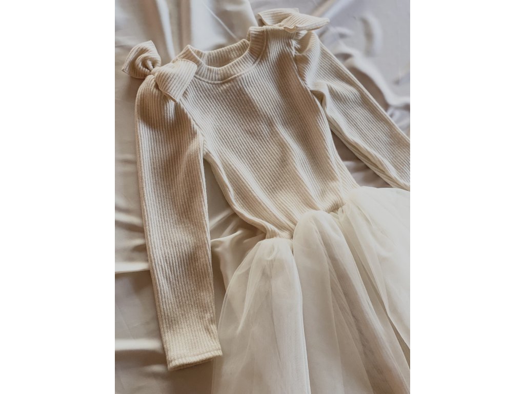 Šaty sú zdobené jemným tylom, ktorý im dodáva ľahkosť a šarm. Vzadu je ozdobná mašľa a mašličky na pleciach dodávajú dievčenský šarm.